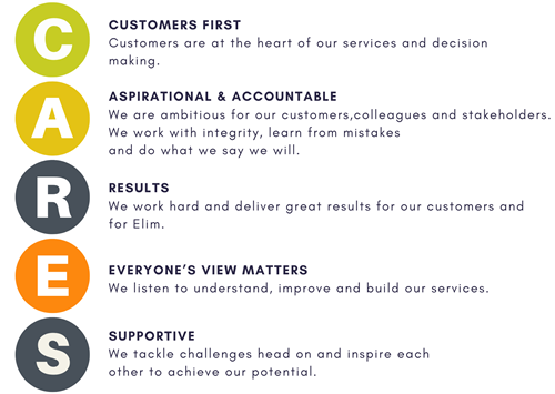 Elim staff, customers, the Board, and stakeholders have developed the Elim CARES values. These values set out how we aim to deliver our services and work together successfully: