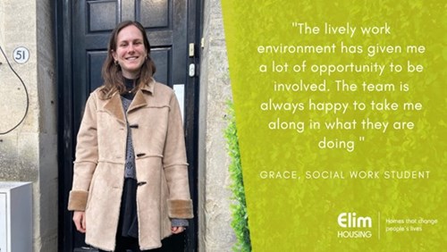 Elim is able to offer a small number of placements to Social Work Students as part of their degree course each year. Students are placed at our Supported Housing Schemes across Bristol, South Gloucestershire and Gloucestershire. Our placements give student social workers first-hand experience of working with vulnerable people, bridging the gap between social care theory and practice. Our placements offer a challenging, varied and interesting introduction to housing support.